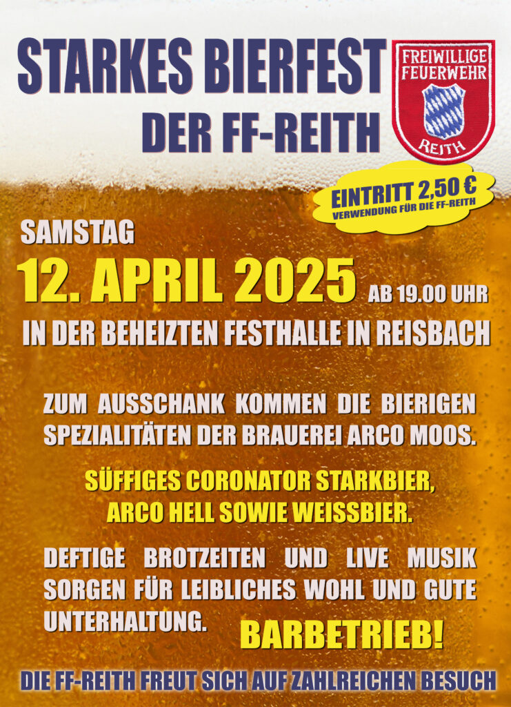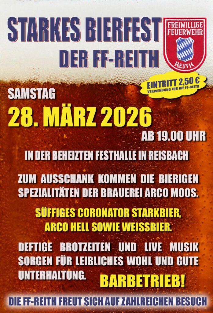 Am 28. März hält die FF Reith, dass vierzehnte Starkbierfest ab. Alle 3dara freuen sich auf euren Besuch. Der Erlös des Starkbierfestes wird in die Erneuerung der Gerätehaus Fassade in Reith investiert.